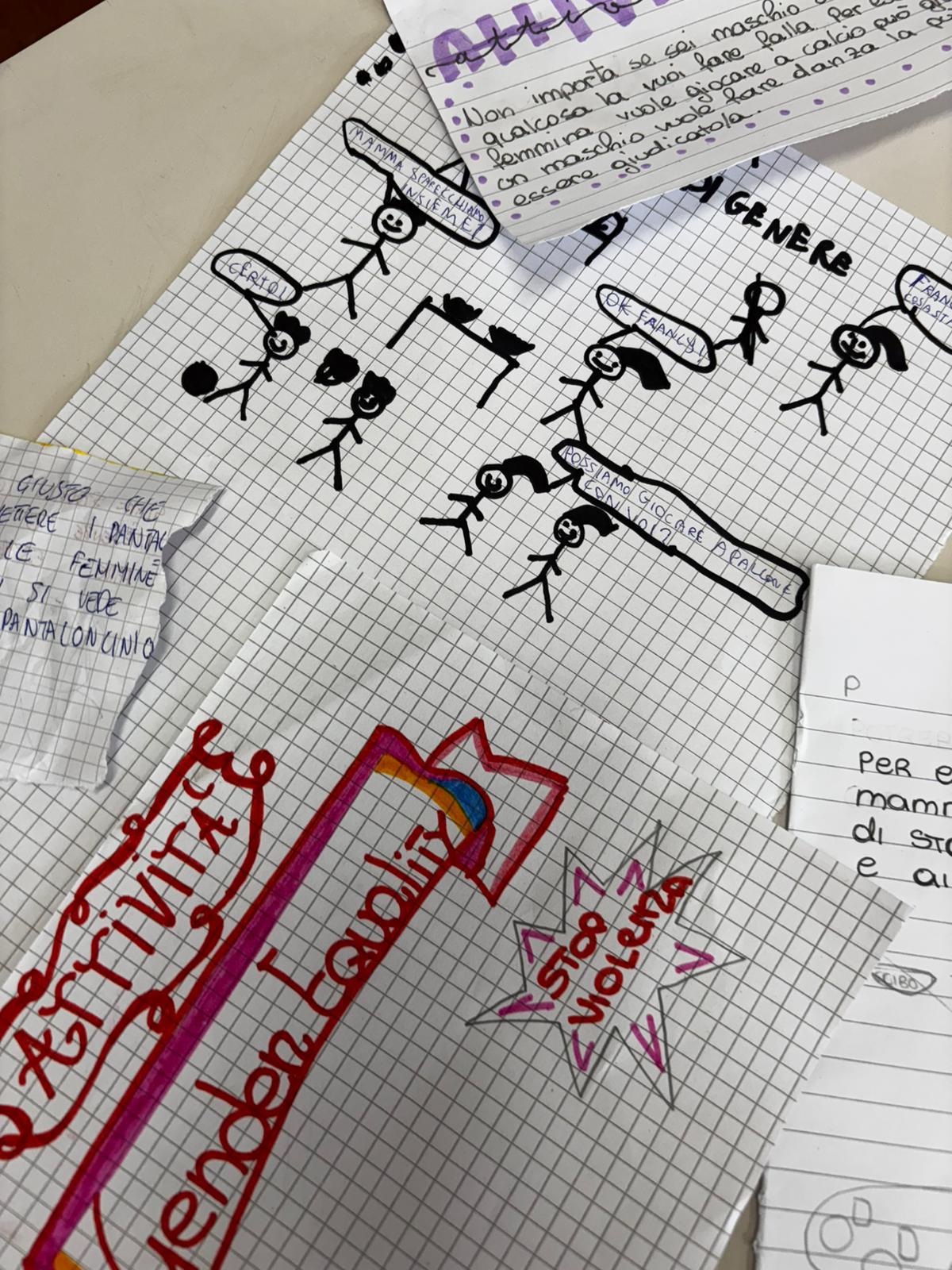 Al termine di ogni giornata, agli alunni e alle alunne sono stati consegnati fogli, colori e penne per esprimere – individualmente o in gruppo – un pensiero o un disegno ispirato ai contenuti trattati.